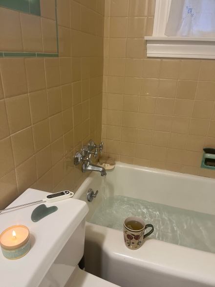 I have created a spa like ritual around plunging. I workout first, because that is what I do. I come home and turn on the kettle for my collagen protein coffee, start the water in the bath tub, and light my “ocean air” candle that my niece bought for me. When the tub is filled, I take a few deep breaths and grab my hot cup of coffee as I get into the tub. I have a few sips of coffee and then I submerge myself in the tub. I breathe my way through it. In the past, I would try my best to distract myself. Now, I sit there and breathe. I feel like I can cross meditation off my to do list. I stay in for three to four minutes. In the past, I would stay in for at least 5. I have found I am cold enough with three to four minutes. I get out, towel off and moisturize myself with coconut oil. I then use a gua sha tool on my face and neck. All of this is done in 15 minutes or so. I feel so much better!
